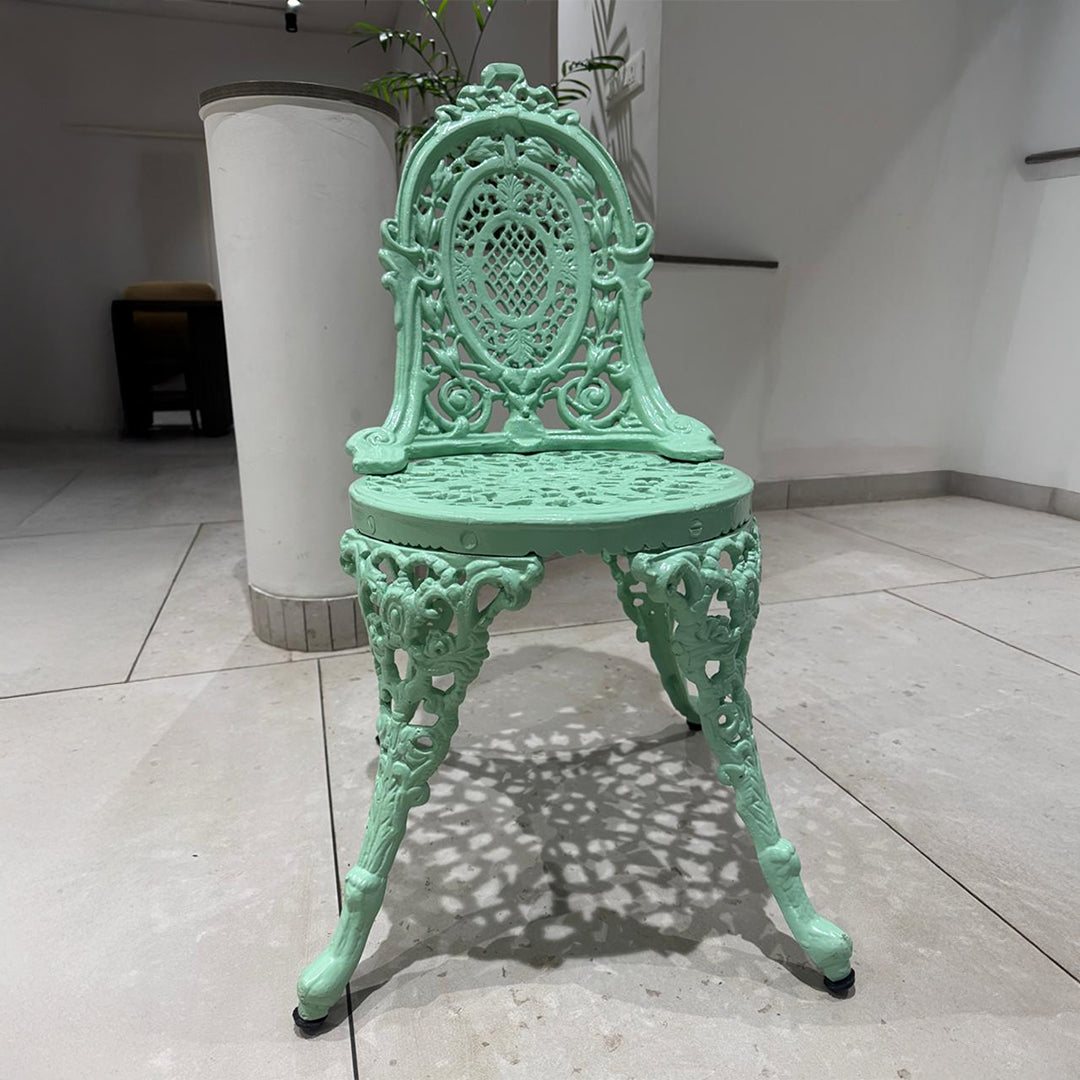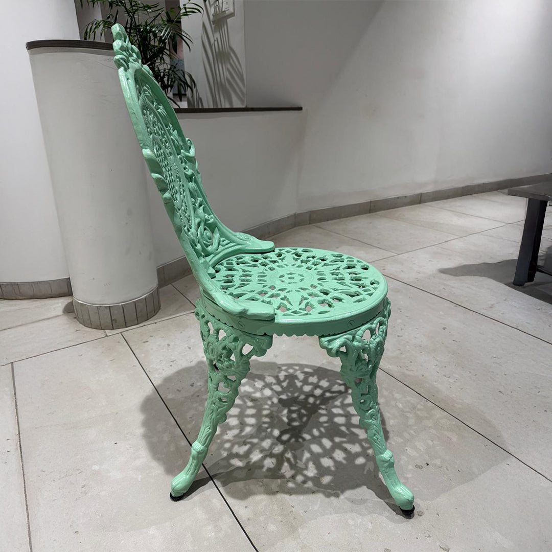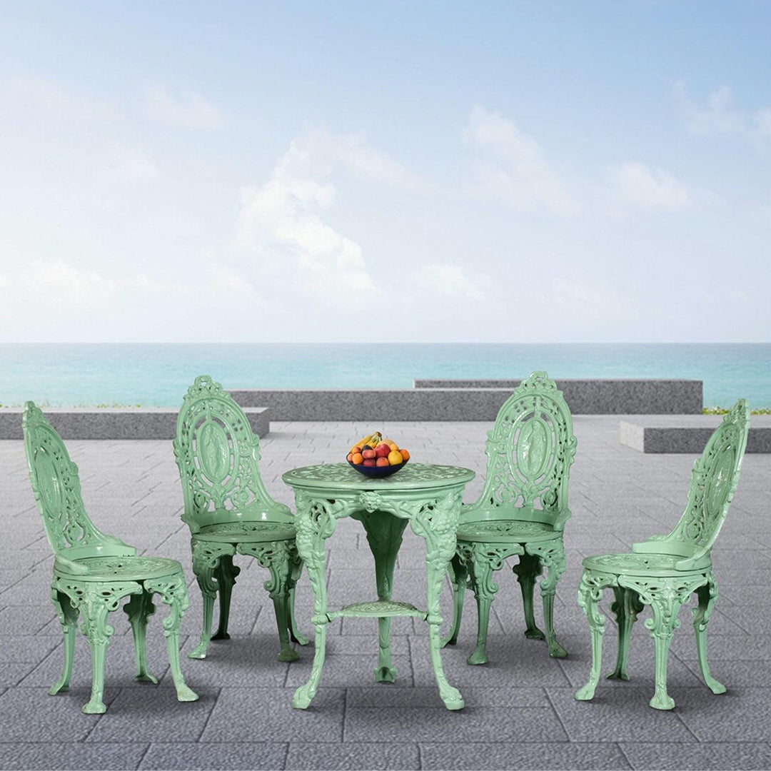 crafted from sturdy cast iron, this outdoor set (4+1) blends strength with elegance. The chair features a refined silhouette with an intricate backrest, while the table's branching base evokes the organic beauty of tree roots-durable, stylish and built for all-season use.