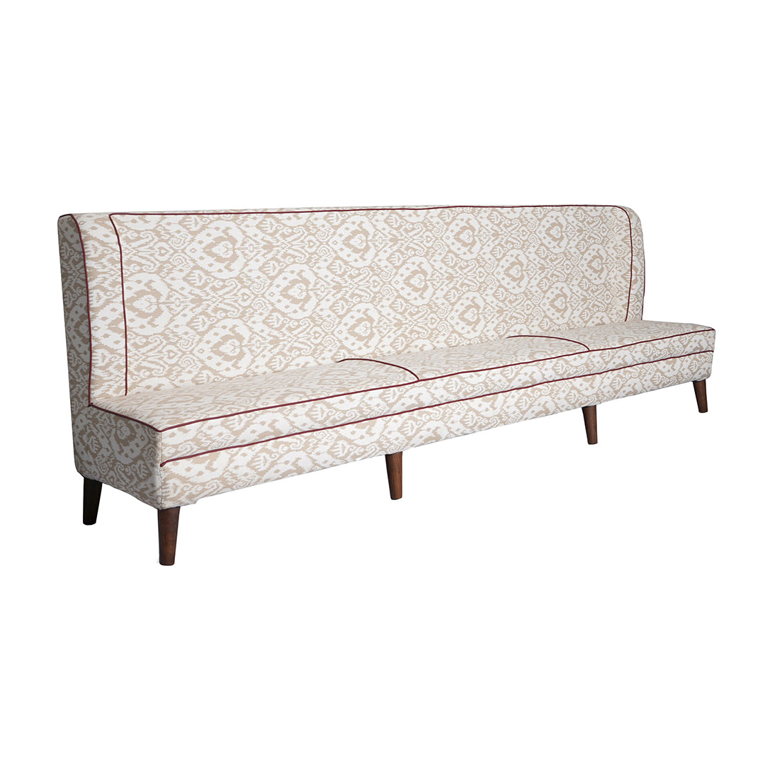 The Elowen waiting sofa is a perfect blend of elgance and comfort. The fabric features an elegant beige ikat- inspired pattern, highlighted with contrasting maroon piping that defines the silhouette beautifully, making it a perfect for dining spaces, lounges or stylish entryways.