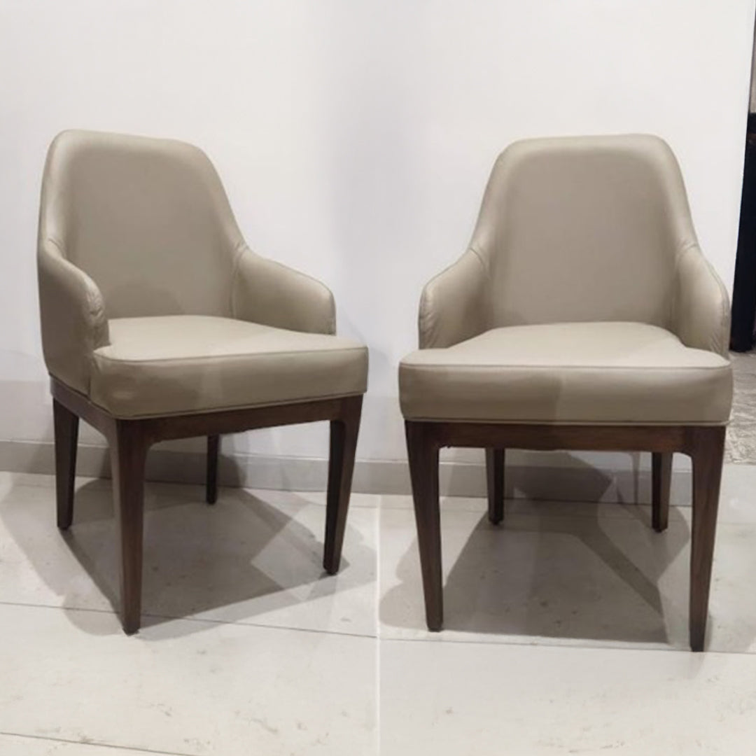 This chair boasts a warm grey leather upholstery with an elegant nail head trim around its edges. The slightly curved back provides a comfortable and stylish seating option, perfect for dining or as an accent piece in a cozy corner.