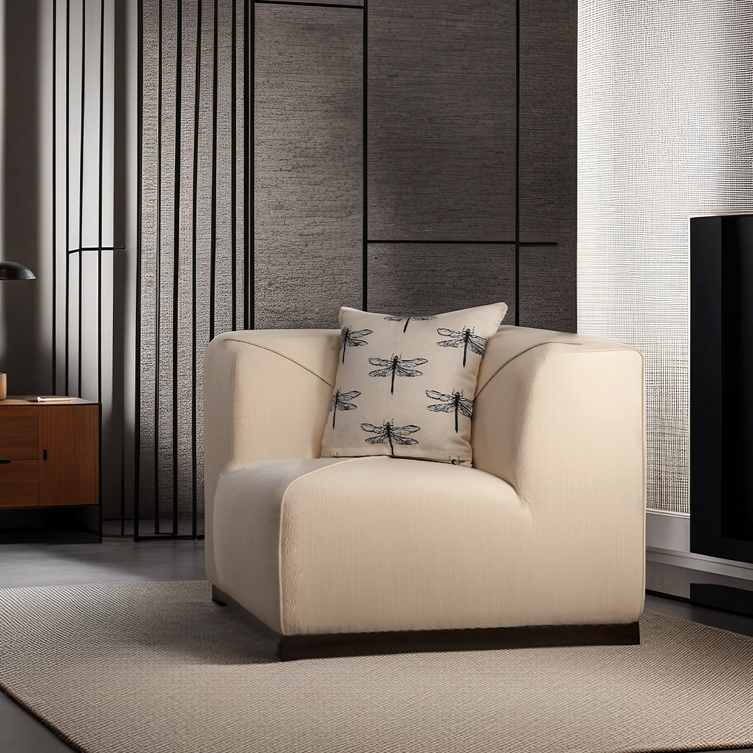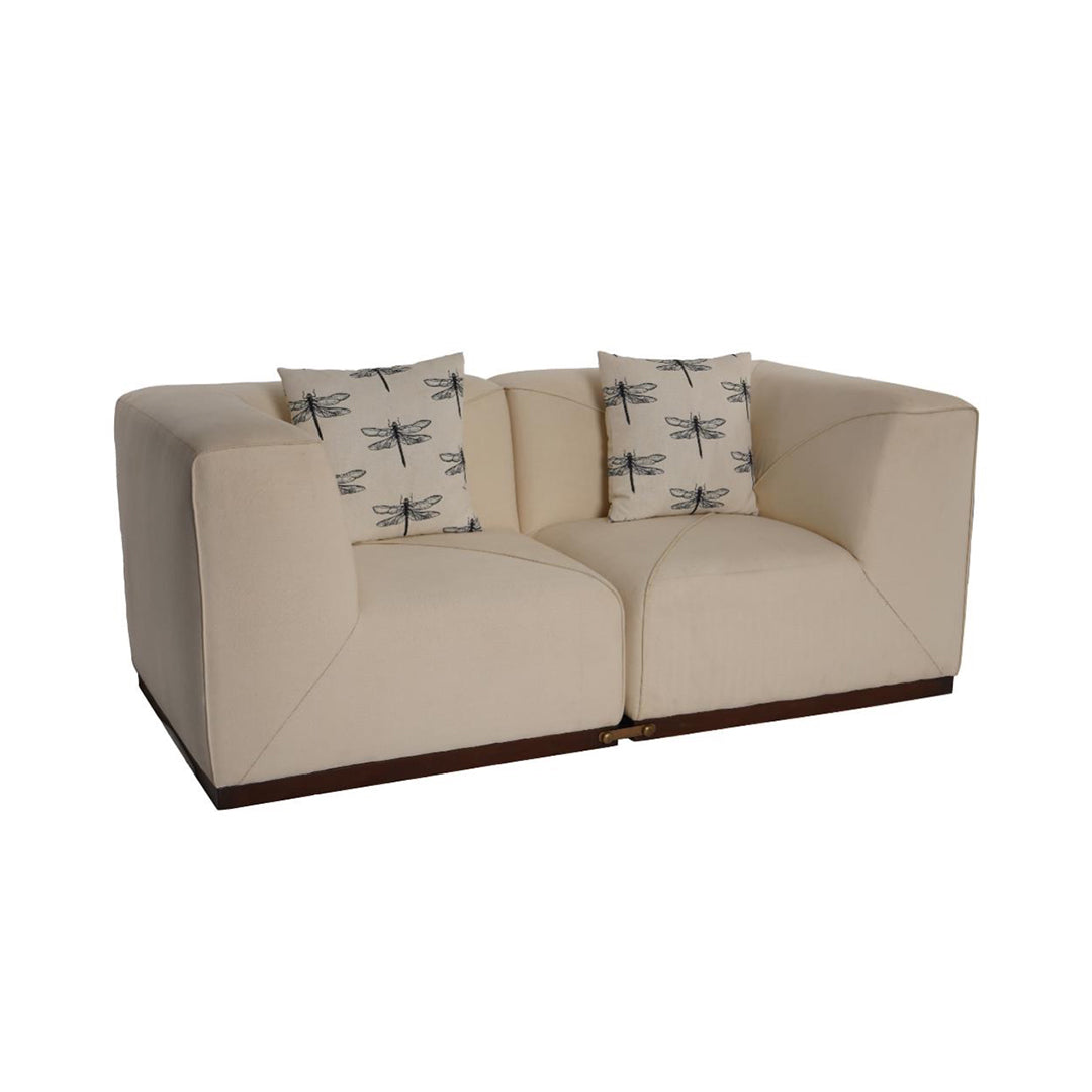 Sumptuous cream loveseat crafted on acacia wood frame. The highlight of this elegant piece is the pair of dragonfly-print cushions. The upholstery is plush and soft, the antique walnut polish is in vogue, while the metal links are proof of robust construction.