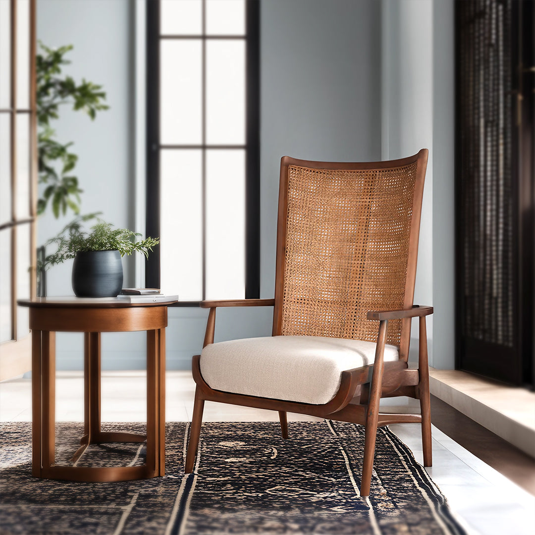 Truly a statement piece, the Wingman lounge chair is a perfect blend of modern design and classic elegance, making it a standout piece in any living space. The dynamic back is crafted from hand-woven cane, adding a touch of artisanal charm and texture to the design.
