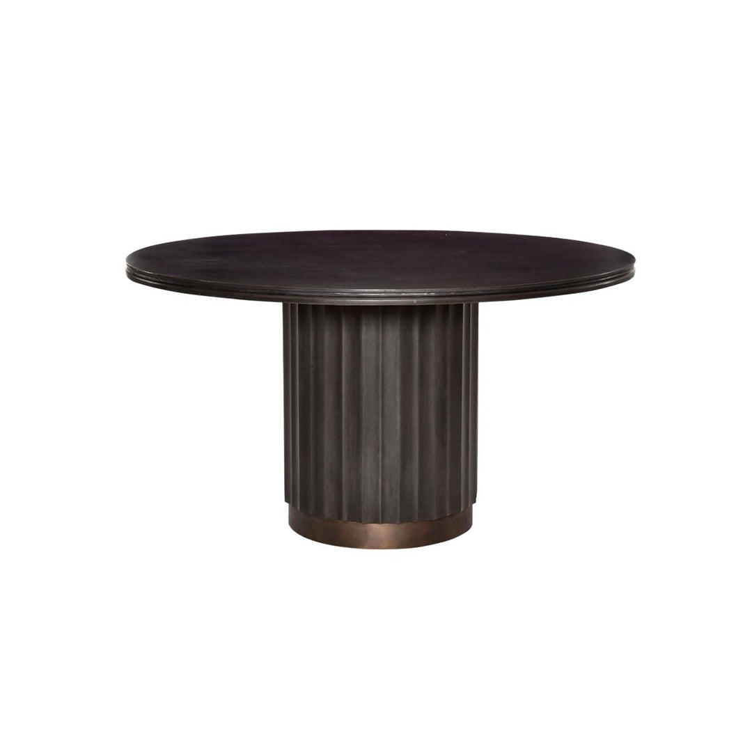 Fluted mango wood table with an iron ring top. Robust and durable, the wood stands out with its elegant coal grey finish and fluted columns. Meanwhile, the table top, with its antique-plated brass finish steals the show.