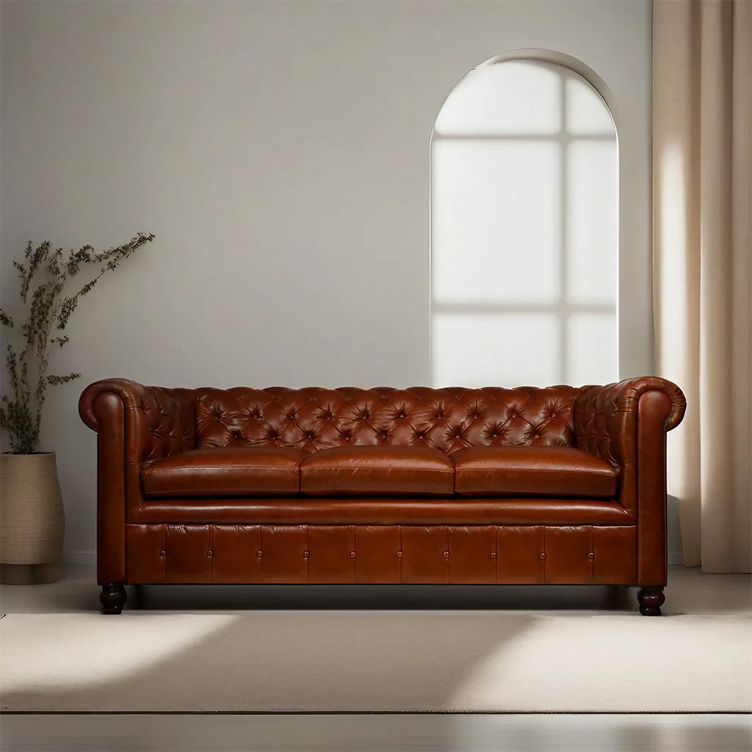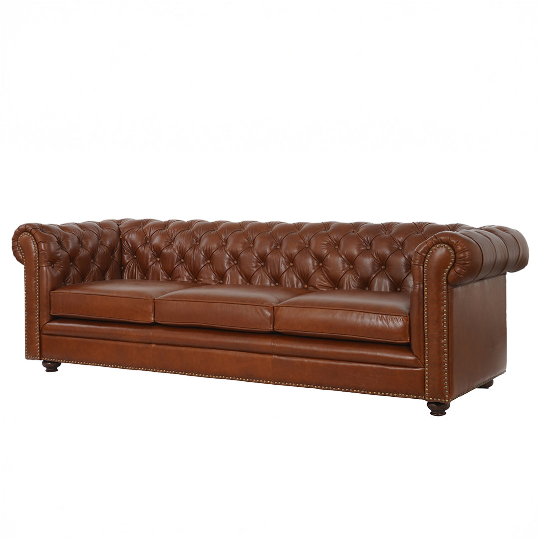 Sumptuous light brown leather sofa crafted with solid acacia wood. The tufted walnut stain upholstery along with the classic rolled arms makes this a dignified centre piece, while the acacia adds in natural warmth and durability.