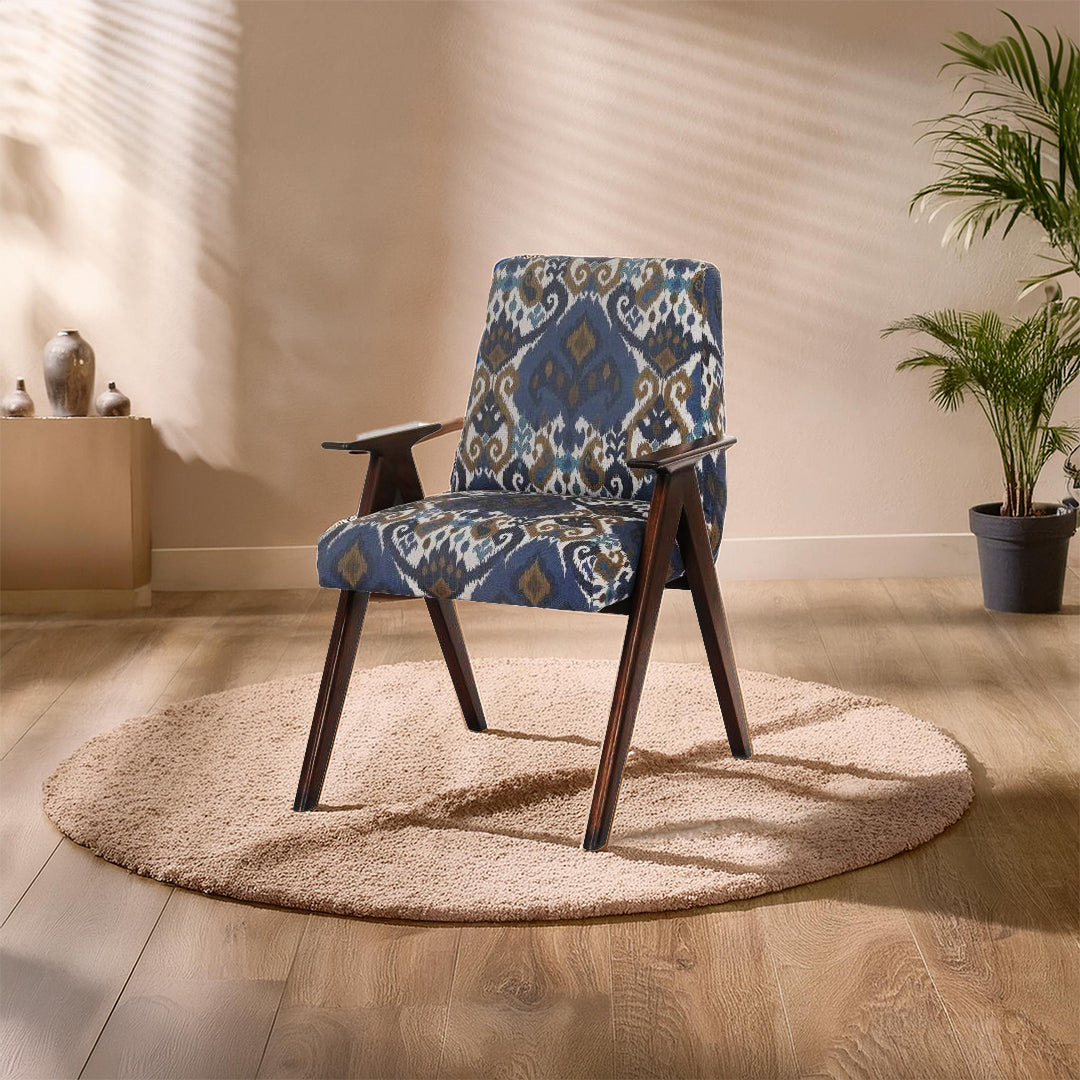 A delightful motif chair built on an acacia framework. The sleek architecture of the legs highlight the graceful form of the piece, while the bold south Asia inspired pattern on the fabric create a true iconic moment.