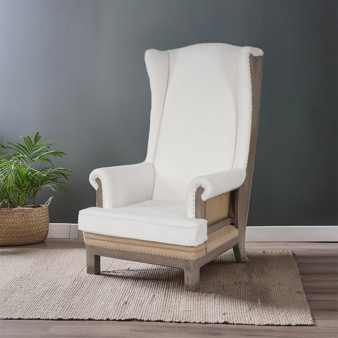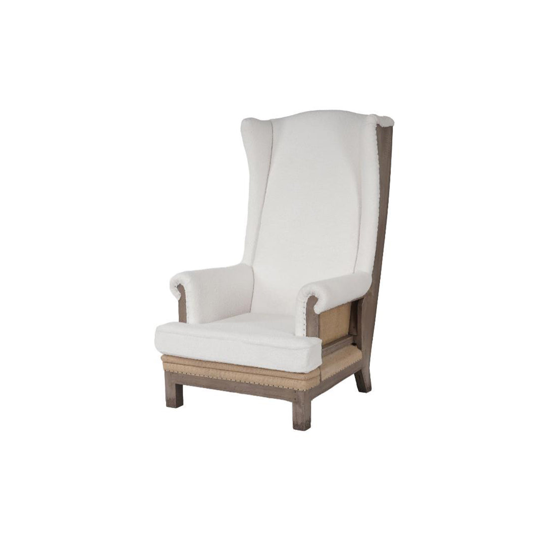 Sophisticated ash grey armchair with an acacia wood frame. The cream upholstery is luxuriously soft and inviting, while the large seat and elaborate arm rests make it the perfect spot after a long day.