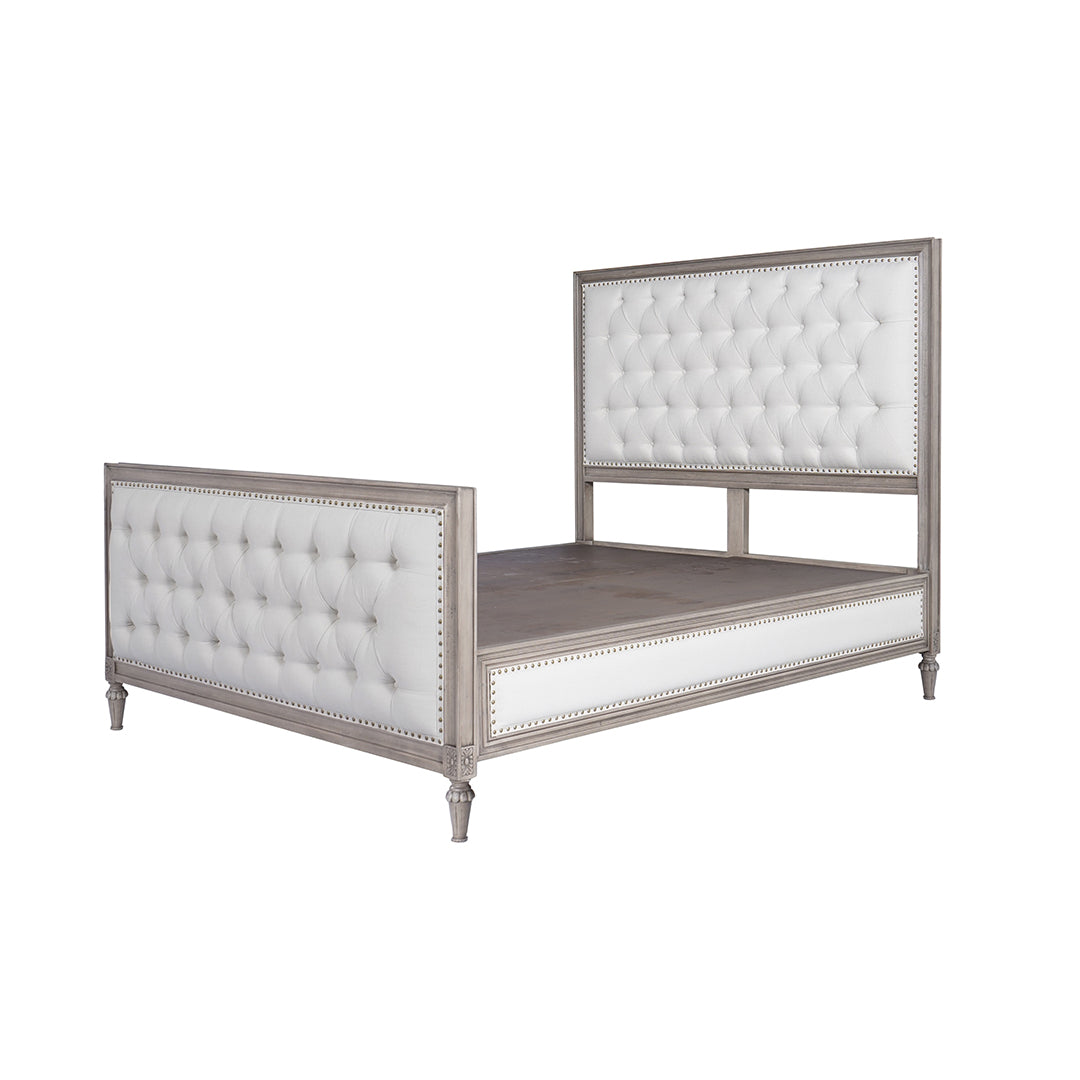 This is a stylish upholstered bed frame with a tufted design. Both the tall headboard and the shorter footboard feature deep button-tufted white fabric panels, bordered with metallic nailhead trim for a sophisticated look. The frame is constructed from acacia wood in a distressed gray finish, adding a rustic yet elegant charm. The legs are tapered and carved with subtle detailing, enhancing the classic design. This bed combines traditional craftsmanship with modern upholstery, making it suitable for a chic and timeless bedroom décor.