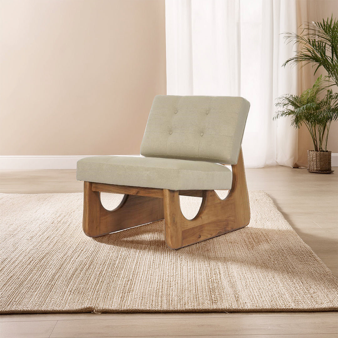 This minimalist chair features a sturdy wooden base with clean lines and soft cushioning in a light beige tone, creating a perfect blend of comfort and contemporary design. Ideal for lounging, it brings a warm, modern touch to any room.